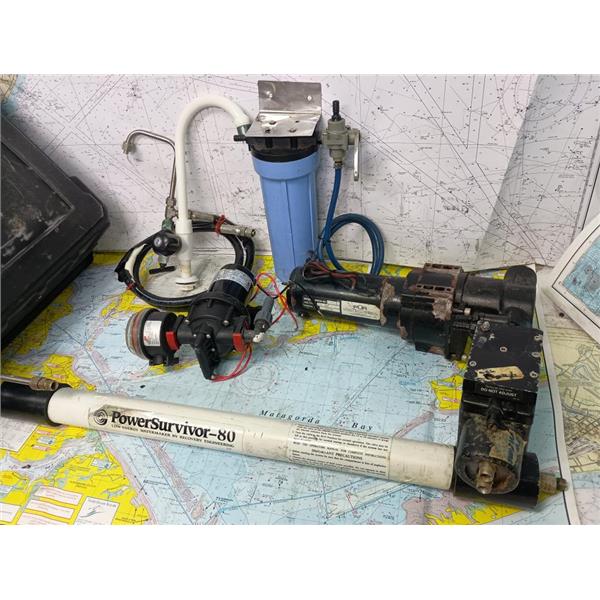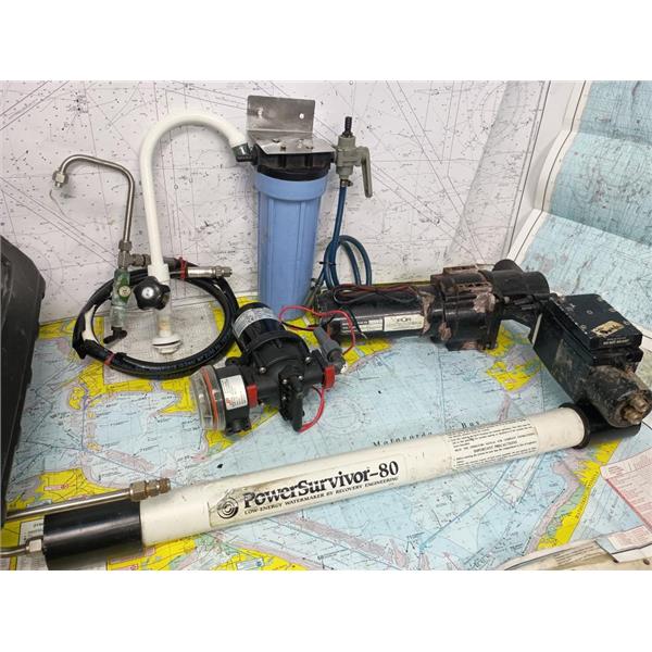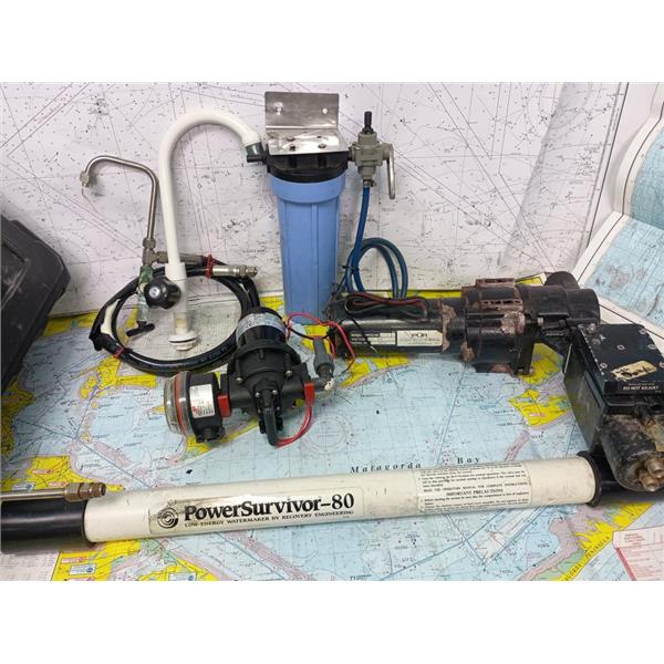 Boaters' Resale Shop of TX 2506 1402.01 POWERSURVIVOR-80 WATERMAKER COMPONENTS * THIS IS NOT A COMPLETE SYSTEM (COMPONENTS ONLY) * SEE ALL 6 PHOTOS * SOLD AS PICTURED * ITEM WAS PREOWNED, USED, IS IN FAIR PHYSICAL CONDITION AND BOTH 12 VOLT MOTOR/PUMP ASSEMBLIES APPEAR TO BE OPERATING PROPERLY BUT HAS NOT BEEN TESTED FURTHER