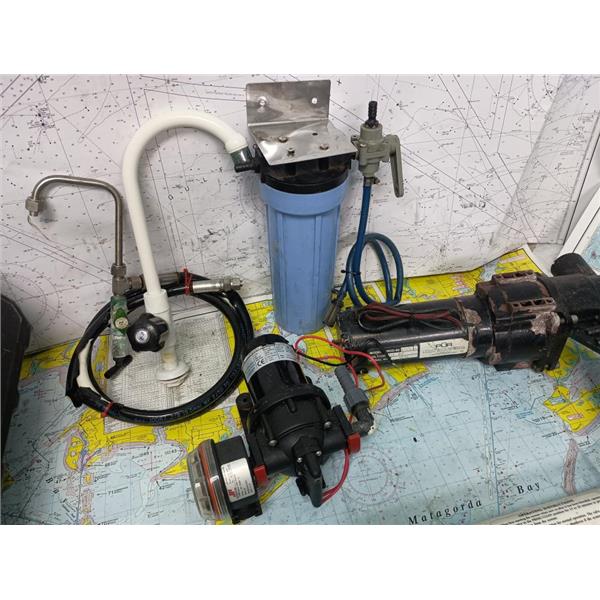 | Condition Description | THIS IS NOT A COMPLETE SYSTEM (COMPONENTS ONLY) * SEE ALL 6 PHOTOS * SOLD AS PICTURED * ITEM WAS PREOWNED, USED, IS IN FAIR PHYSICAL CONDITION AND BOTH 12 VOLT MOTOR/PUMP ASSEMBLIES APPEAR TO BE OPERATING PROPERLY BUT HAS NOT BEEN TESTED FURTHER ONLY COMPONENTS INCLUDED: * KATADYN POWERSURVIVOR-80 MEMBRANE UNIT * PUR MROD-80-LM2 12 VOLT MOTOR/PUMP UNIT * JOHNSON 12 VOLT SPXFLOW TYPE WSP 2.9 MOTOR/PUMP with STRAINER ASSEMBLY * PRE-FILTER, VALVE & HOSE ASSEMBLY * NUPROP VALVE with METAL FITTINGS & HOSE ASSEMBLY * HOSE |