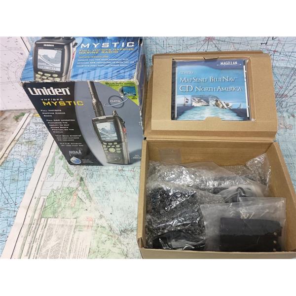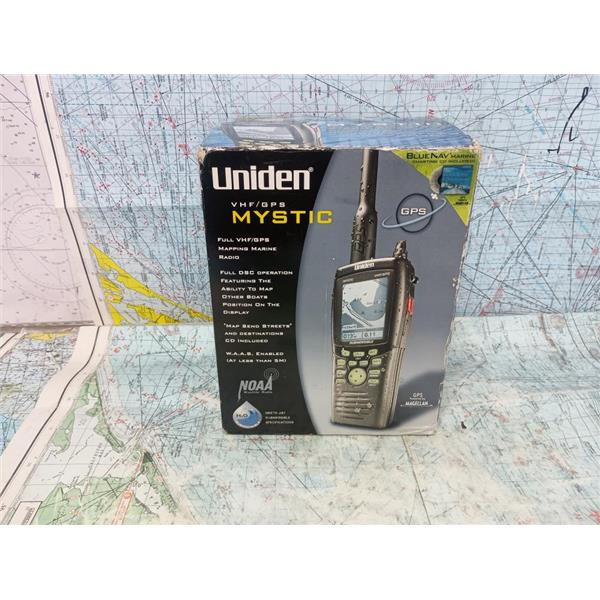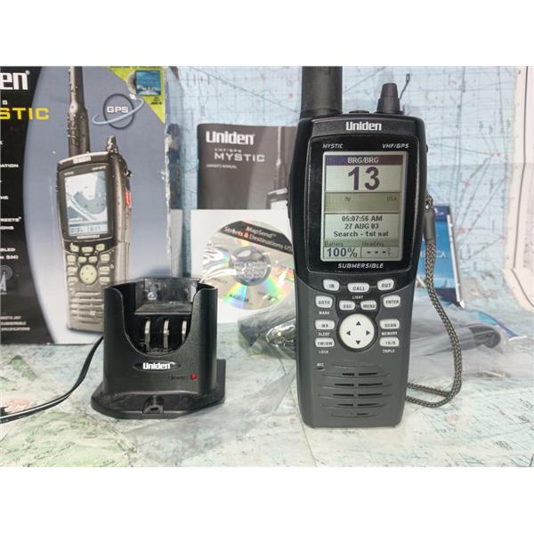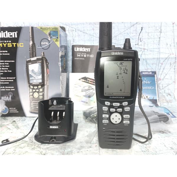 Boaters' Resale Shop of TX 2601 1706.01 UNIDEN MYSTIC VHF/GPS HAND-HELD RADIO KIT IN BOX * SEE ALL 8 PHOTOS & DETAILS * SOLD IN CONDITION PICTURED * SOME ASSEMBLY WILL BE REQUIRED WHEN SHIPPED * ITEM WAS PREOWNED, IN ORIGINAL BOX & PACKING, IN GREAT PHYSICAL CONDITION AND APPEARS TO BE OPERATING PROPERLY, POWERS UP, CONTROLS WORK, RECEIVES NOAA WEATHER AUDIO, RECEIVES AND TRANSMITS WHEN MIC IS KEYED BUT HAS NOT BEEN TESTED FURTHER