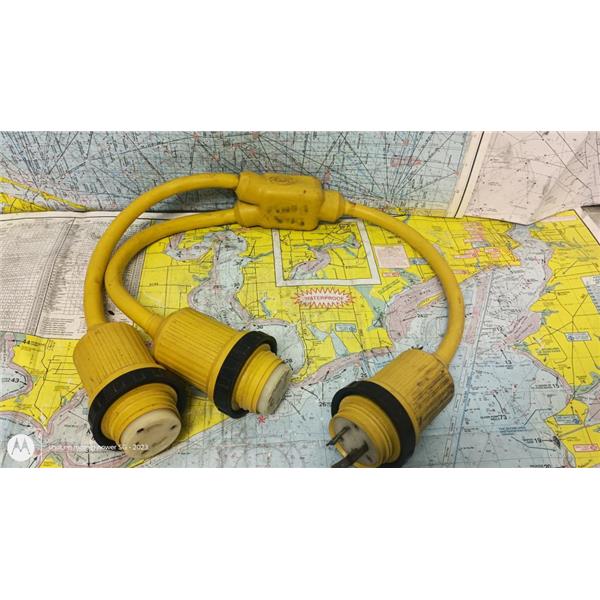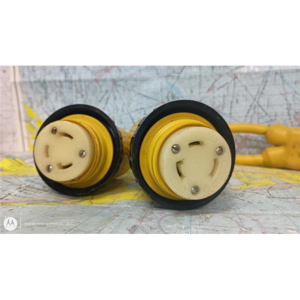 Boaters' Resale Shop of TX 2603 0801.15 MARINCO 30 AMP 125 VOLT Y-ADAPTER 157AY * TWO-30A 125V Female Locking w/Sealing Collar System to ONE-30A 125V Male Locking Plug * SEE ALL 5 PHOTOS & DETAILS * SOLD IN CONDITION PICTURED * CONNECTION COVERS NOT INCLUDED * ITEM WAS PREOWNED, USED, SHOWS TYPICAL SIGNS OF WEAR FROM USE AND WEATHER (MINOR STAINS & CORROSION) BUT IS IN FAIR NAUTICAL PHYSICAL CONDITION AND APPEARS TO BE OPERATING PROPERLY, PASSES CONTINUITY TEST BUT HAS NOT BEEN TESTED FURTHER