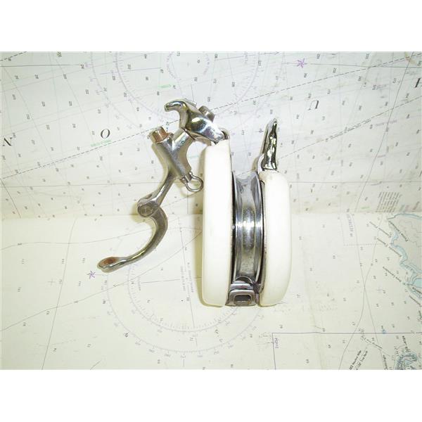 NICRO MARINE WHITE SNATCH BLOCK WITH TRUNION FOR 5/8" LINE MAX * ITEM WAS PRE-OWNED, USED, HAS SOME INK MARKS & IS IN GOOD WORKING CONDITION * APPROX. OVERALL DIMENSIONS: 2-1/4" T x 3-1/2" W x 8" L *