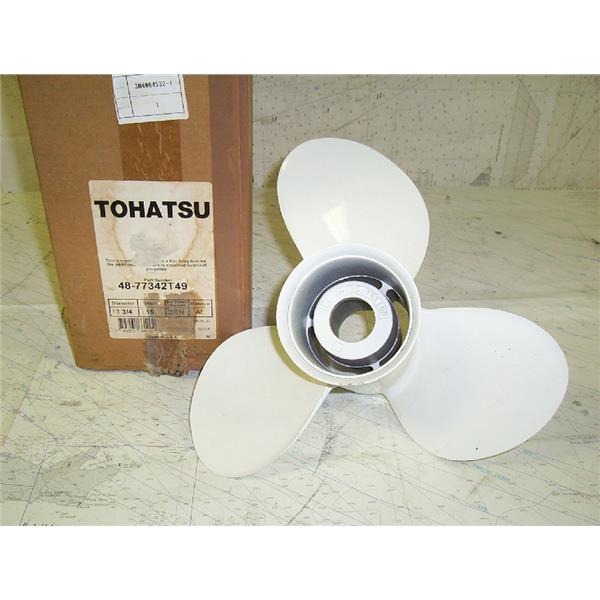 Boaters’ Resale Shop Of Tx 1506 1524.15 TOHATSU 3 BLADE PROP WITH 13-3/4" DIAMETER, RIGHT HAND ROTATION, 15 PITCH * PART NO. 48-77342T49 * ITEM WAS PRE-OWNED, APPEARS TO HAVE NEVER BEEN INSTALLED AND IN GOOD PHYSICAL CONDITION
