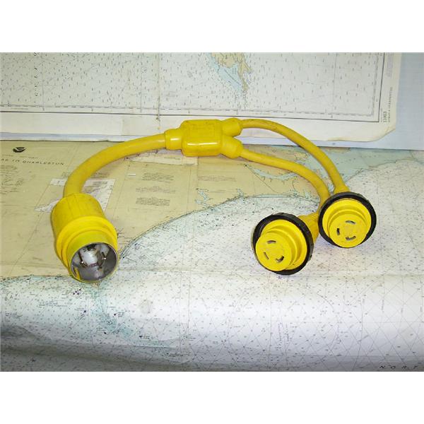 Boaters’ Resale Shop of TX 1608 1547.02 MARINCO PART # 152AY SHOREPOWER Y ADAPTER with Two 30A 125V Locking w/ Sealing Collar System Female Connectors and a 50A 125V Locking Male Plug * "Y" adapters let you split one dock side receptacle between the two boat inlets of similar or different power configurations. They are fully molded and equipped with the Marinco unique sealing collar and covers (where indicated) for use in wet locations.