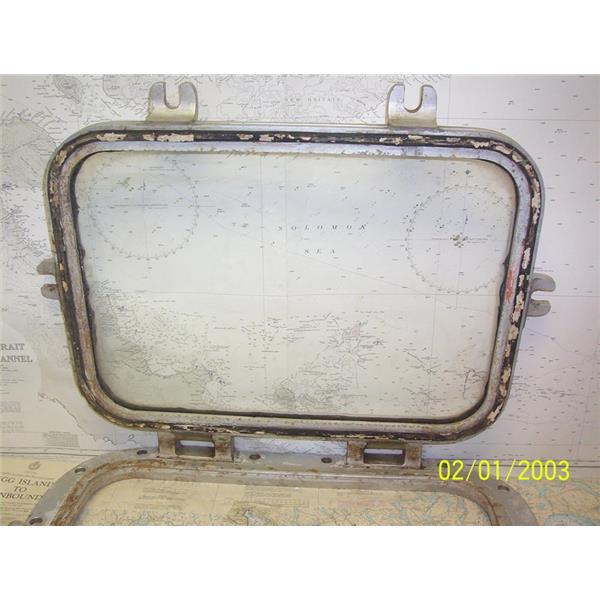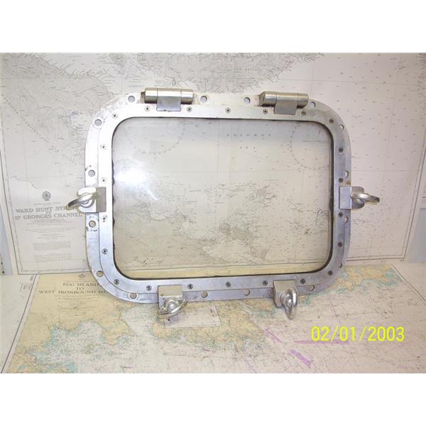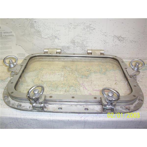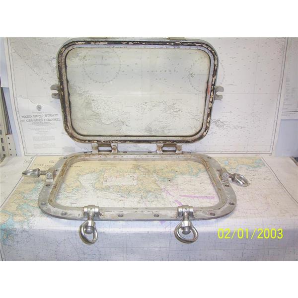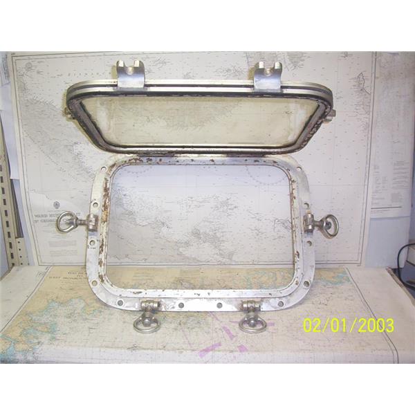 Boaters’ Resale Shop of TX 2108 5101.01 HEAVY DUTY 18" x 24" OPENING PORTLIGHT WITH 15" x 21" CUT-OUT * STAMPED ON FRAME: "FOR ARMOURED GLASS ONLY" * SEE ALL 6 PHOTOS * SOLD AS PICTURED * ITEM WAS PRE-OWNED, USED, GASKET WILL NEED TO BE REPLACED, IN FAIR PHYSICAL CONDITION AND HINGES & DOGS APPEARS TO BE OPERATING PROPERLY BUT HAS NOT BEEN TESTED FURTHER