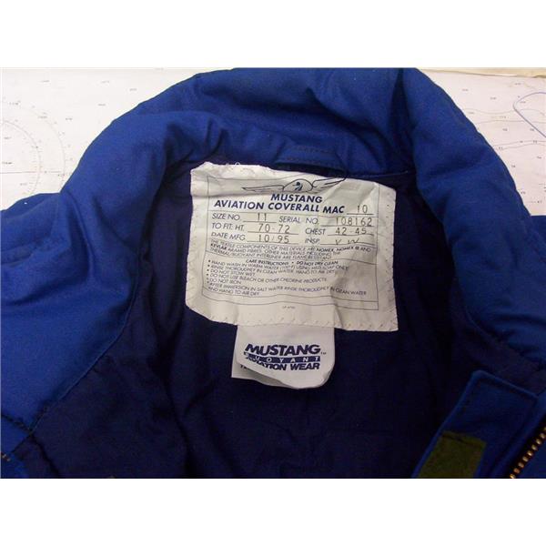 Boaters’ Resale Shop of TX 2112 1521.01 MUSTANG SIZE 11 AVIATION COVERALLS MAC 10 with HEAD COVER * MUSTANG SURVIVAL BUOYANT SIZE 11 AVIATION COVERALLS MAC 10 * TO FIT HEIGHT: 70-72 * CHEST: 42-45 * MFG. DATE: 10/95 * FLAME RESISTANT NOMEX, NOMEX III & KEVLAR ARAMID FIBRES * APPROX. WEIGHT: 6 LBS. * SEE ALL 8 PHOTOS * SOLD AS PICTURED * HEAD COVER INCLUDED * ITEM WAS PRE-OWNED, USED, IN FAIR PHYSICAL CONDITION AND APPEARS TO BE OPERATING PROPERLY BUT HAS NOT BEEN TESTED FURTHER
