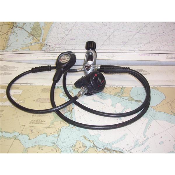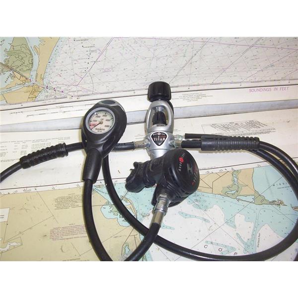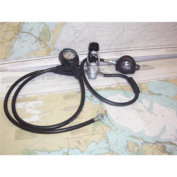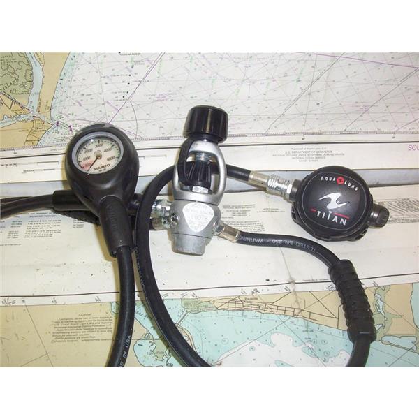 Boaters’ Resale Shop of TX 2203 0755.21 AQUA LUNG TITAN SCUBA REGULATOR 6042799 ASSEMBLY with SINGLE MOUTHPIECE & SUUNTO GAUGE * "6042799" "0078" & "EN 250" STAMPED ON REGULATOR * SEE ALL 4 PHOTOS * SOLD AS PICTURED * ITEM WAS PRE-OWNED, USED, IN FAIRLY GOOD PHYSICAL CONDITION AND APPEARS TO BE OPERATING PROPERLY BUT HAS NOT BEEN TESTED