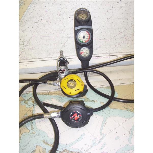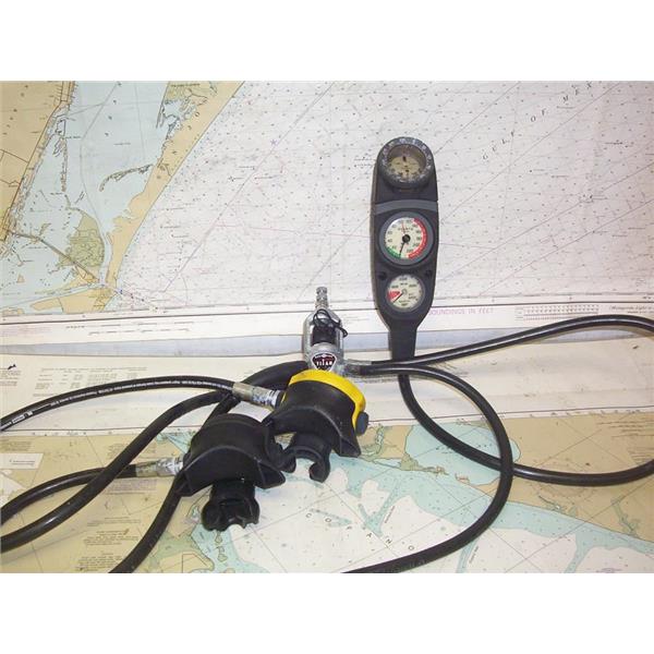 Boaters’ Resale Shop of TX 2203 0755.25 AQUA LUNG TITAN FC6307 SCUBA REGULATOR SECOND STAGE OCTOPUS with 2 MOUTHPIECES (US DIVERS & OCTOPUS) & SUUNTO GAUGES & COMPASS * "FC6307" "0078" & "EN 250" STAMPED ON REGULATOR * SEE ALL 4 PHOTOS * SOLD AS PICTURED * ITEM WAS PRE-OWNED, USED, IN FAIR PHYSICAL CONDITION AND APPEARS TO BE OPERATING PROPERLY BUT HAS NOT BEEN TESTED