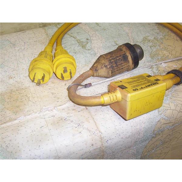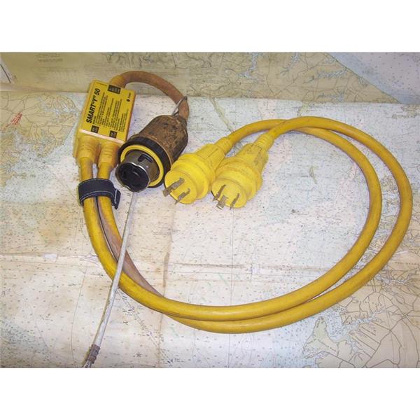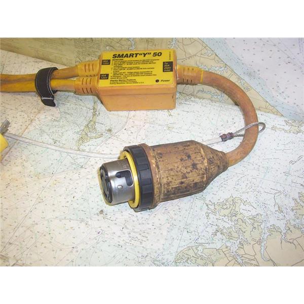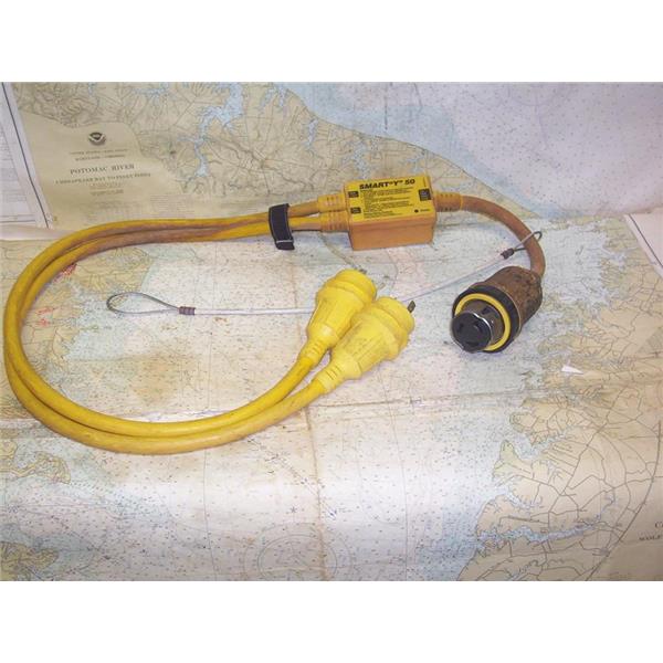 Boaters’ Resale Shop of TX 2212 0222.01 CHARLES SMART"Y" 50 AMP REVERSE "Y" ADAPTER # 93-SMTY50-A with CABLE FOR LOCKING INCLUDED * (1) 50 Amp 125/250V (Female) Boat Side to (2) 30 Amp 125V (Male) Dock Side Plugs * SEE ALL 4 PHOTOS * SOLD AS PICTURED * ITEM WAS PRE-OWNED, USED, IN FAIR PHYSICAL CONDITION AND HAS NOT BEEN TESTED