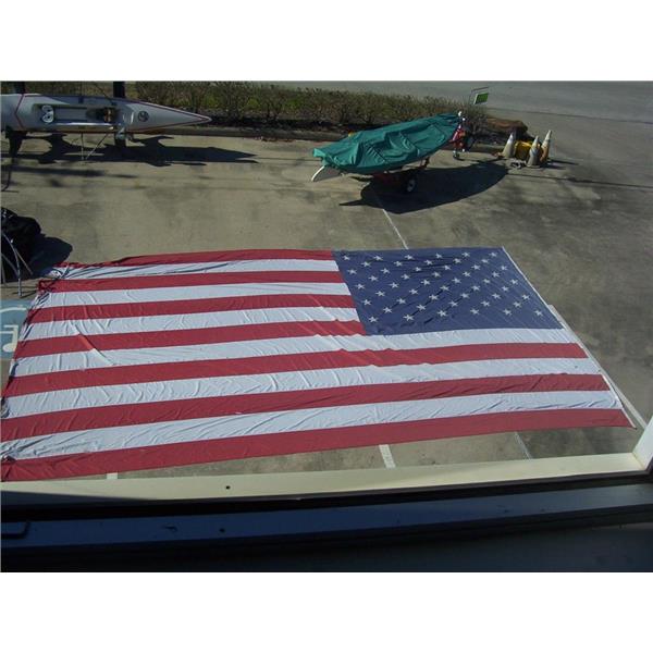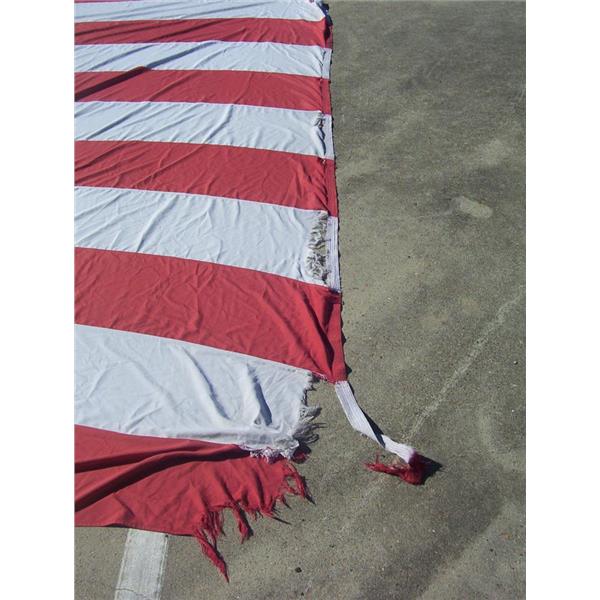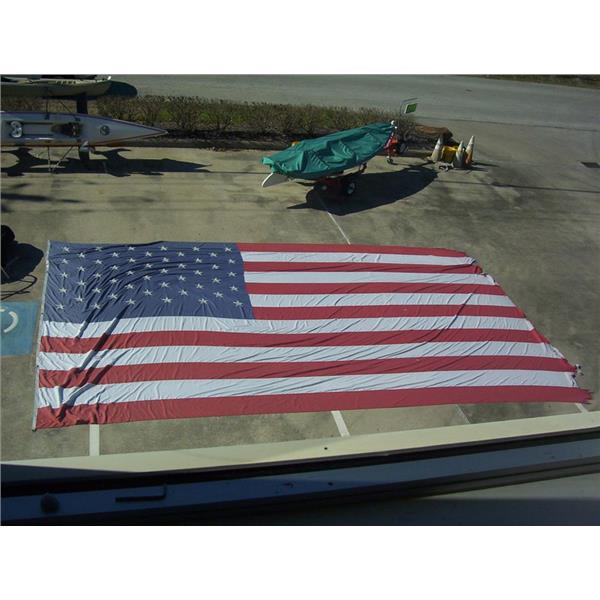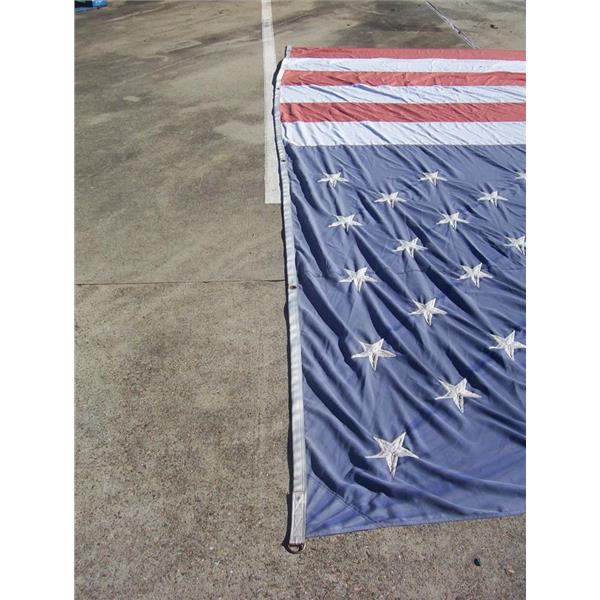 Boaters’ Resale Shop of TX 2212 3127.53 UNITED STATES 10' x 25' POLYESTER FLAG with 5 RING/GROMMETS * 95% POLYESTER * 5% OTHER MATERIAL * APPROX. WEIGHT: 17 LBS. * SEE ALL 7 PHOTOS * SOLD AS PICTURED * ITEM WAS PRE-OWNED, USED, THE STARS & END ARE FRAYING (TEARS & HOLES)BUT IS IN FAIR PHYSICAL CONDITION