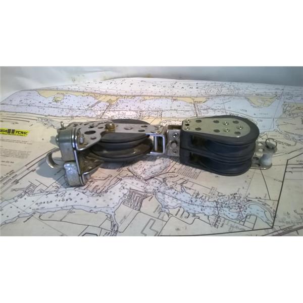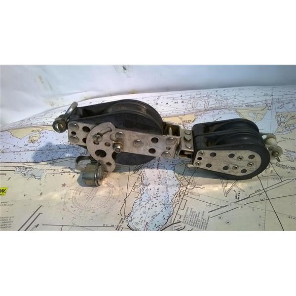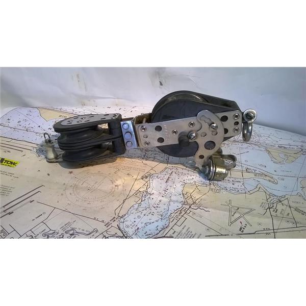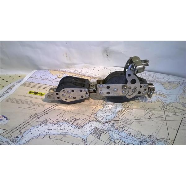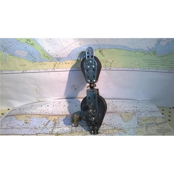 Boaters' Resale Shop of TX 2302 5142.34 HARKEN 4:1 MAINSHEET RATCHET BLOCK ASSEMBLY * CONSIST OF: HARKEN RATCHET FIDDLE BLOCK with BECKET, CAM CLEAT AND SWIVEL DOUBLE BLOCK with BECKET FOR 3/8" LINE MAX * SEE ALL 6 PHOTOS * SOME ASSEMBLY MAY BE REQUIRED * ITEM WAS PRE-OWNED, USED, SOLD AS PICTURED AND IS IN FAIR PHYSICAL CONDITION AND APPEARS TO BE OPERATING PROPERLY BUT HAS NOT BEEN TESTED FURTHER