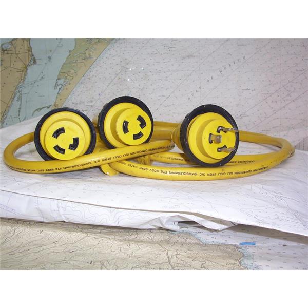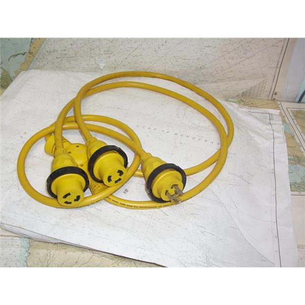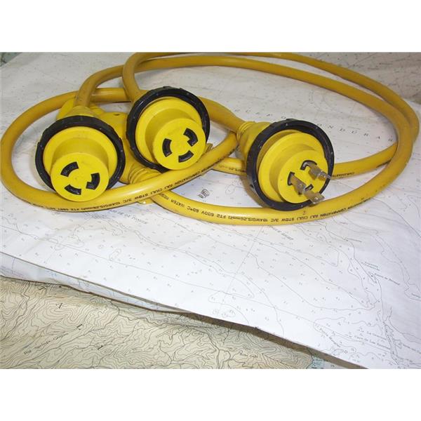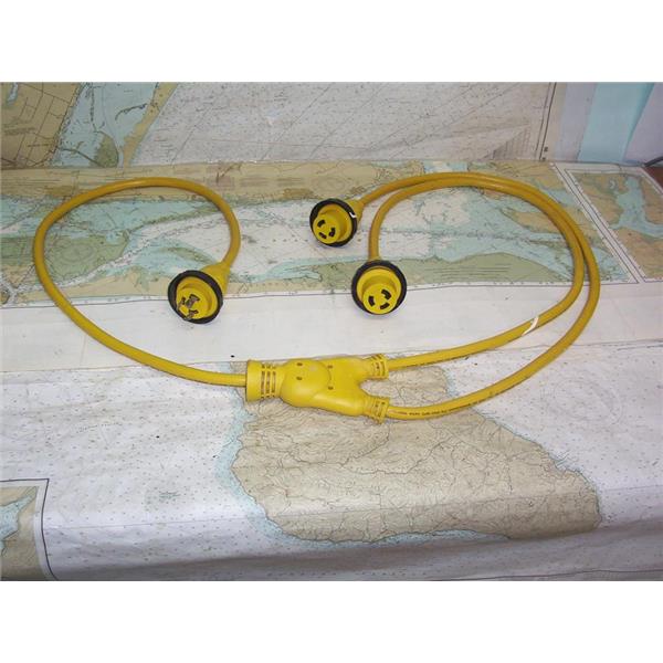 Boaters’ Resale Shop of TX 2303 0407.01 SHOREPOWER 30 AMP 125 VOLT Y ADAPTER FOR BOAT & RV 9 FOOT 30 AMP 125 VOLT AC SHOREPOWER Y ADAPTER CABLE with ONE 30 AMP 125 VOLT MALE PLUG (LA530PW) to TWO 30 AMP 125 VOLT FEMALE PLUGS (LA530RW) * STAMPED ON PLUGS: LA530PW to (2) LA530RW * SEE ALL 5 PHOTOS * SOLD AS PICTURED * ITEM WAS PRE-OWNED, USED, PLUGS ARE IN FAIRLY GOOD PHYSICAL CONDITION AND APPEARS TO BE OPERATING PROPERLY, PASSES CONTINUITY TEST BUT HAS NOT BEEN TESTED FURTHER