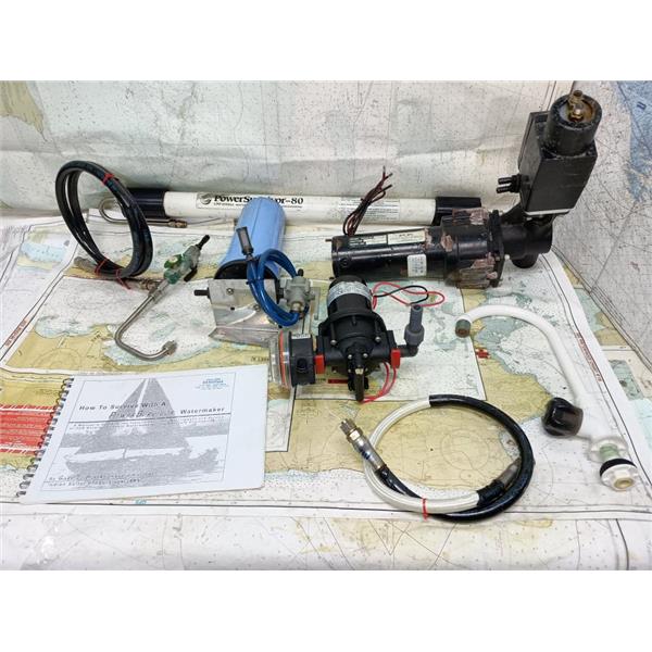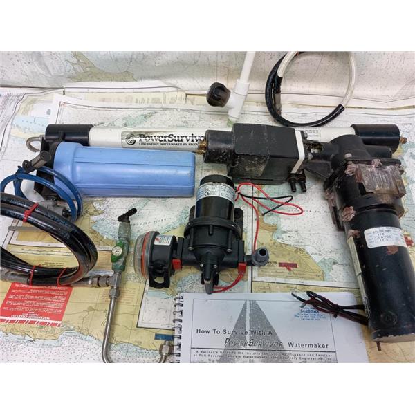 Boaters' Resale Shop of TX 2310 5421.11 POWERSURVIVOR-80 MARINE WATERMAKER COMPONENTS * THIS IS NOT A COMPLETE SYSTEM (COMPONENTS ONLY) * SEE ALL 7 PHOTOS * SOLD AS PICTURED * ITEM WAS PRE-OWNED, USED, IS IN FAIR PHYSICAL CONDITION AND BOTH 12 VOLT MOTOR/PUMP ASSEMBLIES APPEAR TO BE OPERATING PROPERLY BUT HAS NOT BEEN TESTED FURTHER