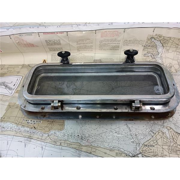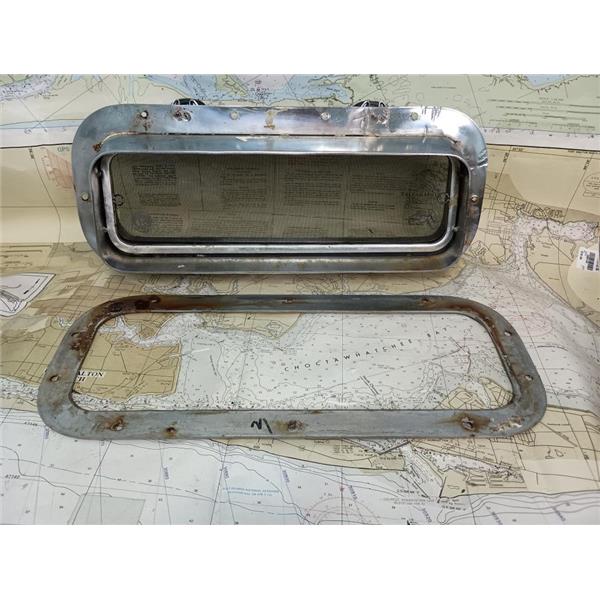 Boaters' Resale Shop of TX 2312 1422.01 WHISPER OPENING SS PORTLIGHT KIT w 5" x 16" CUT-OUT, SCREEN & TRIM * 4 PIECE KIT COMES APART: STAINLESS STEEL MAINFRAME with DOGGS & HINGES, LENS & GASKET ASSEMBLY, SCREEN & TRIM * SEE ALL 6 PHOTOS * SOLD AS PICTURED * ITEM WAS PREOWNED, USED, WILL BE NEED MORE CLEANING BUT IS IN FAIR PHYSICAL CONDITION AND APPEARS TO BE OPERATING PROPERLY BUT HAS NOT BEEN TESTED FURTHER
