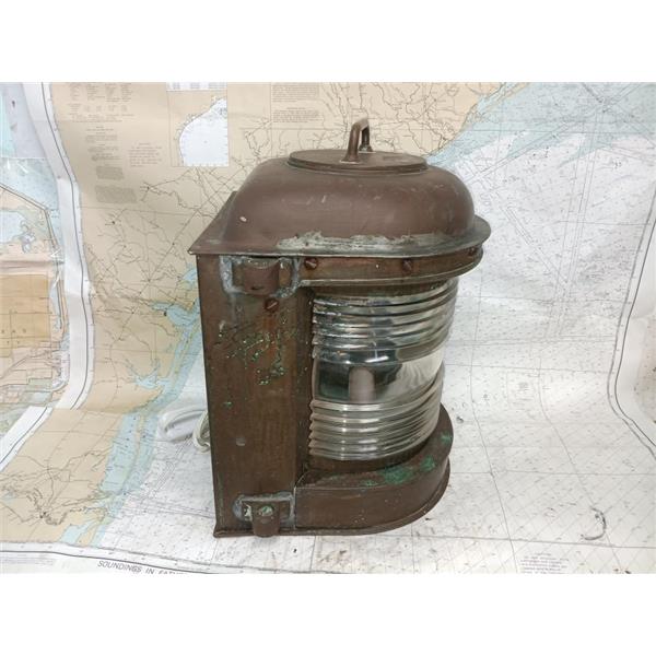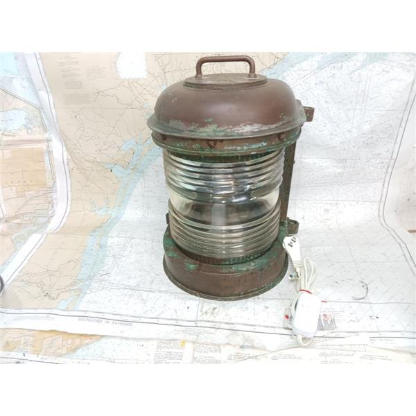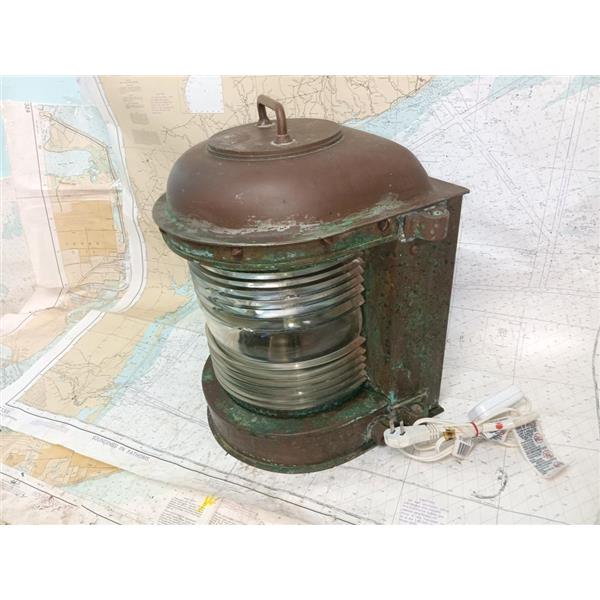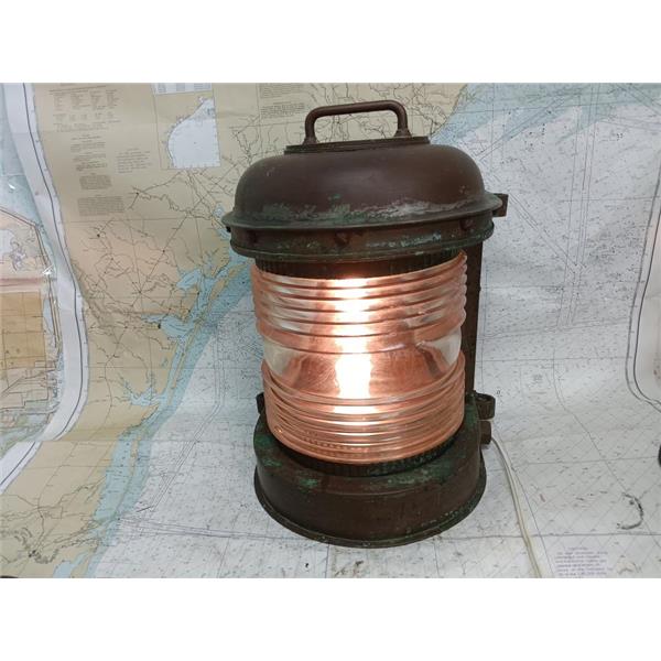 Boaters' Resale Shop of TX 2409 0171.04 VINTAGE 15" NAV LIGHT WIRED AS 110V LAMP * VINTAGE 15" BRASS STERN NAVIGATION LIGHT with FRESNEL LENSES & HANDLE by A. WARD HENDRICKSON & COMPANY CONVERTED INTO A MODERN 110 VOLT WIRED LAMP * SEE ALL 8 PHOTOS * SOLD IN CONDITION PICTURED * ITEM WAS PREOWNED, VINTAGE, USED, THE FRESNEL LENSES HAS SOME DAMAGE IN SPOTS BUT IS IN FAIR VINTAGE CONDITION AND THE CONVERTED FIXTURE & WIRING APPEAR TO BE OPERATING PROPERLY BUT HAS NOT BEEN TESTED FURTHER