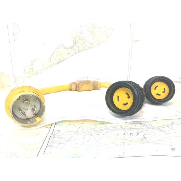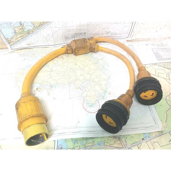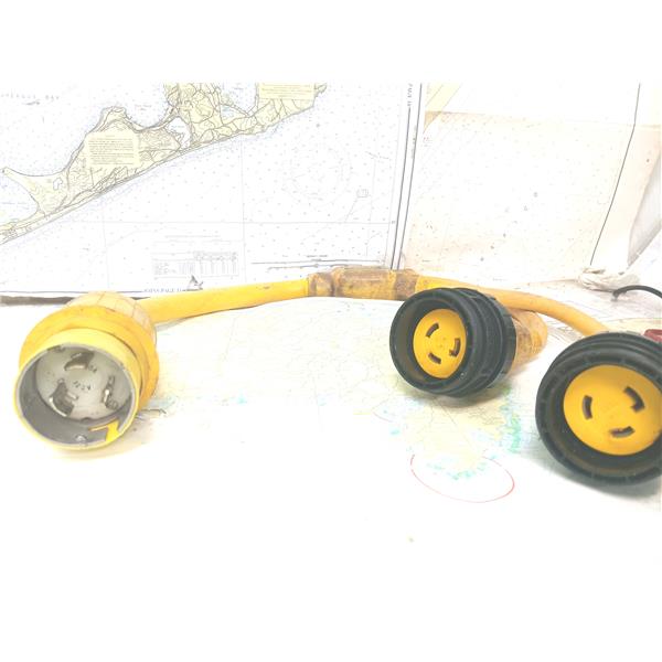 Boaters' Resale Shop of TX 2501 7721.17 MARINCO Y-ADAPTER 152AY 50A125V-30A125V * Y Adapter, 50A 125V Male To (2) 30A 125V Females * Part#152AY * SEE ALL 5 PHOTOS & DETAILS * SOLD IN CONDITION PICTURED * ITEM WAS PREOWNED, USED, SHOWS TYPICAL SIGNS OF WEAR FROM USE AND WEATHER BUT IS IN FAIR NAUTICAL PHYSICAL CONDITION AND APPEARS TO BE OPERATING PROPERLY AND CONNECTORS ARE IN FAIRLY GOOD PHYSICAL CONDITION AND PASSES A CONTINUITY TEST BUT HAS NOT BEEN TESTED FURTHER