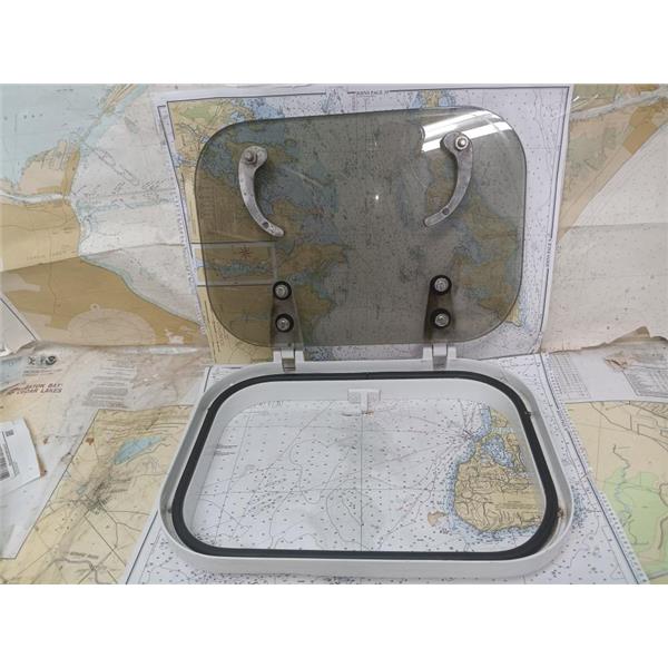 Boaters' Resale Shop of TX 2504 2304.02 MARINE 3" x 13.25" x 16.5" OPENING HATCH * METALLIC COMPOSITE FRAME with TINTED PLEXI-GLASS, TWO HINGES & TWO LATCHES * SEE ALL 6 PHOTOS & DETAILS * SOLD IN CONDITION PICTURED * ITEM WAS PREOWNED, USED, SHOWS TYPICAL SIGNS OF WEAR FROM USE AND WEATHER (MINOR STAINS & CORROSION) & LATCHES APPEAR TO HAVE BEEN CUSTOMIZED, BUT IS IN FAIR NAUTICAL PHYSICAL CONDITION AND APPEARS TO BE OPERATING PROPERLY BUT HAS NOT BEEN TESTED FURTHER