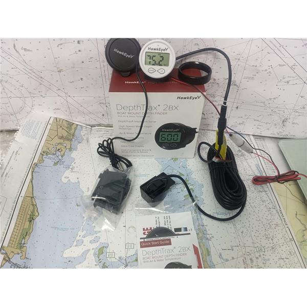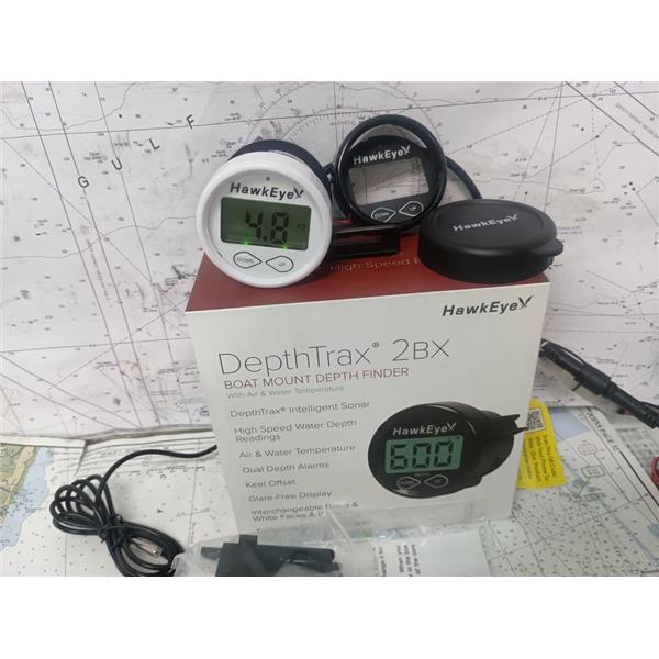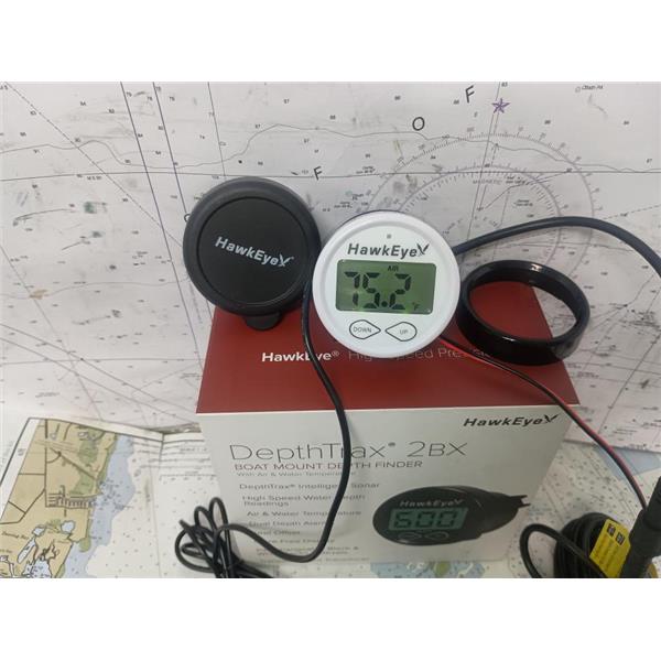 Boaters' Resale Shop of TX 2507 0507.02 HAWKEYE DEPTH & TEMP FINDER KIT DT2BX-TM * DepthTrax In-Dash Digital Depth & Temp Gauge - Transom Mount Transducer * SEE ALL 8 PHOTOS * SOLD AS PICTURED * ITEM WAS PREOWNED, IN ORIGINAL BOX & PACKING, IN GREAT PHYSICAL CONDITION AND APPEARS TO HAVE NEVER BEEN INSTALLED OR DEPLOYED AND POWERS UP, CONTROLS WORK AND DISPLAYS DEPTH & TEMPS BUT HAS NOT BEEN TESTED FURTHER