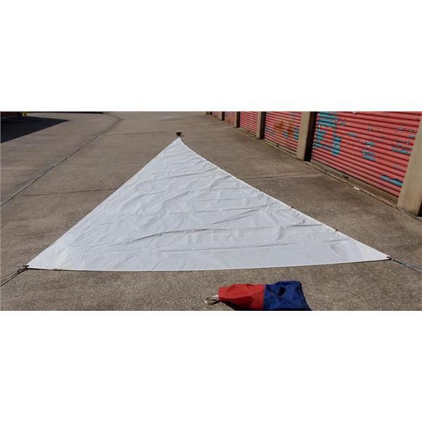 Minor Stains * Small Holes in Tack(Taped) * Rope Luff with #1 Hanks * Generally clean and cloth has life in it, no significant damage or chafe * Generally clean, cloth getting softer, may have minor repairs/stains * Coastal Cruising or Club Racing Sail * Bay or Lake Day Sailing Sail * Red & Blue Sail Bag
