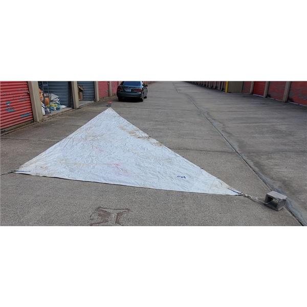 | Condition Description | Corrosion on Hanks & Grommets * Stained (Needs A Wash) * Rope Luff with #2 Hanks * Generally clean, cloth getting softer, may have minor repairs/stains * Bay or Lake Day Sailing Sail * Yellow Sail Bag Included |