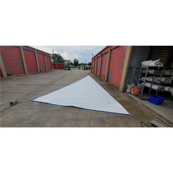 | Condition Description | RF Jib Converted to Rope Luff with #2 Hanks * Pacific Blue RF Suncover on Port Side * * Head of Tack Webbing is Loose & Needs Replacement * Lower Hank Grommet Torn * Stained * Generally clean, cloth getting softer, may have minor repairs/stains * Bay or Lake Day Sailing Sail |