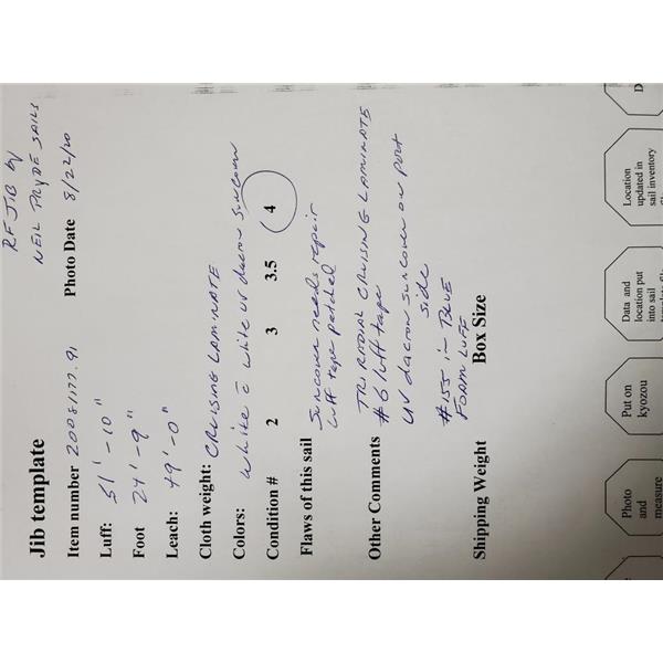 cloth weight: Cruising Laminate * total weight of sail: 62 lbs * Loc. FSR * photo date: 8/22/20